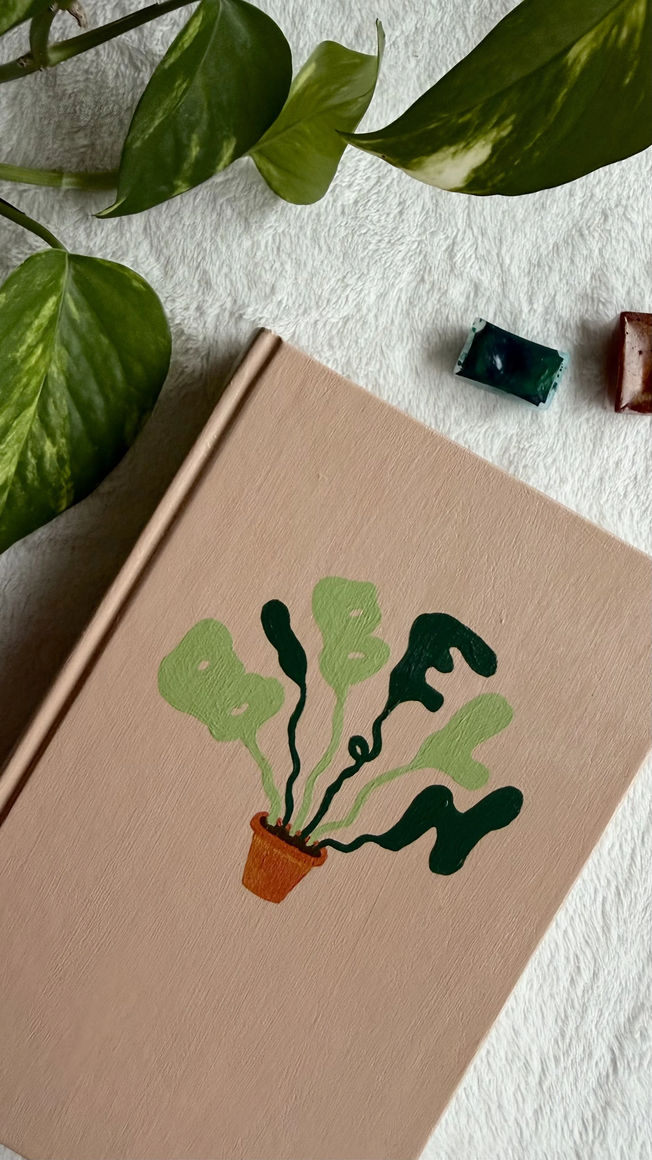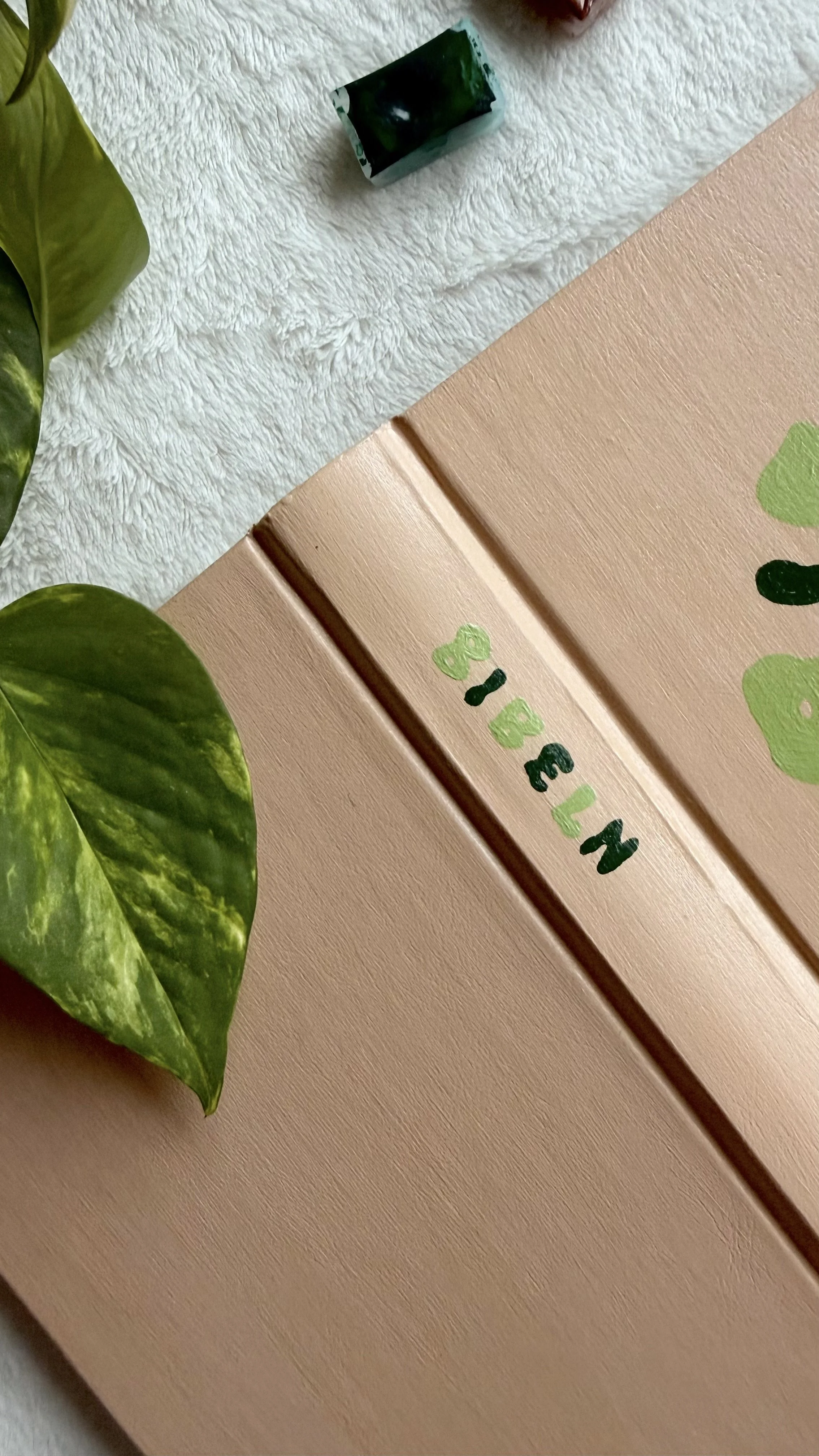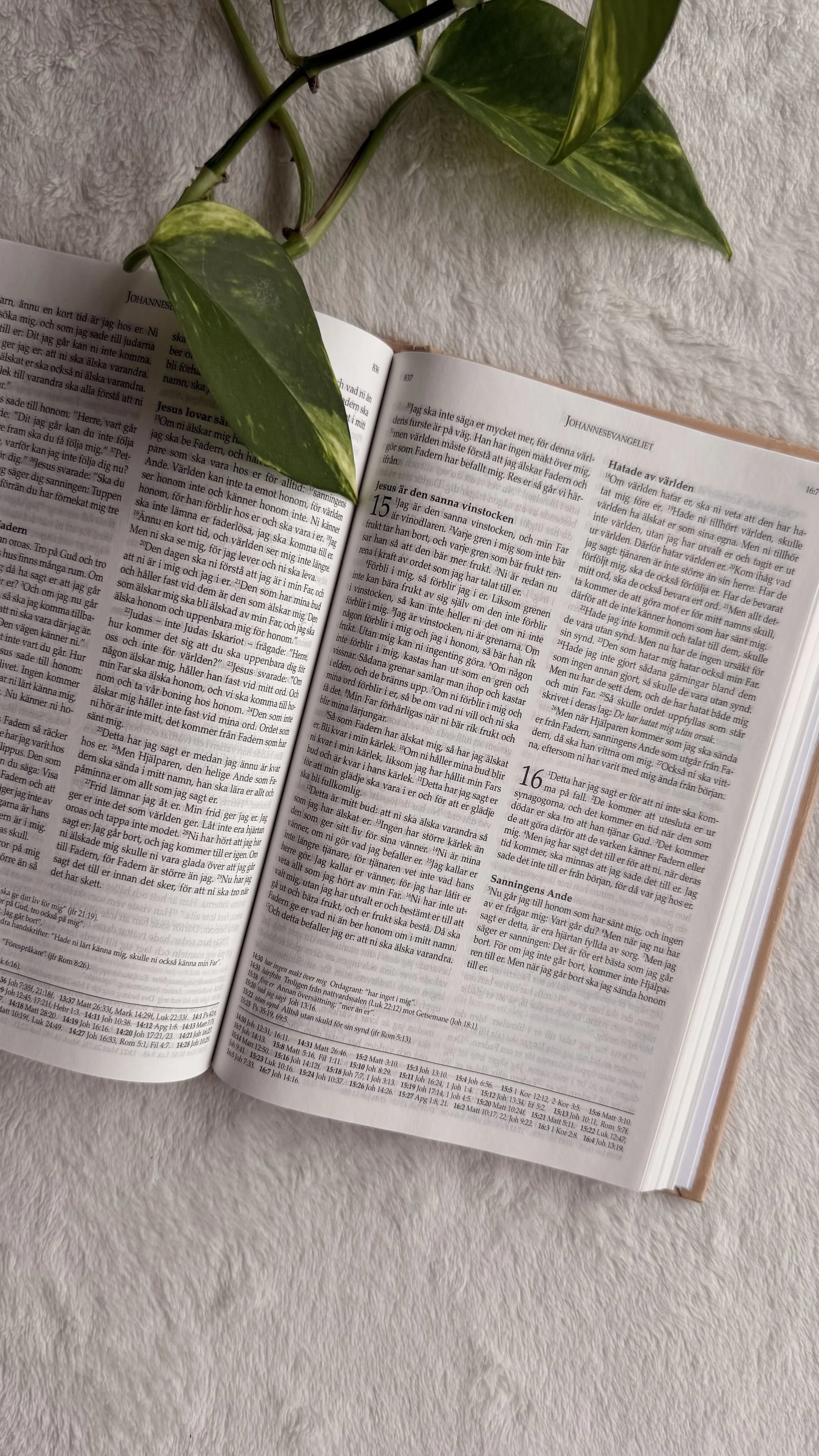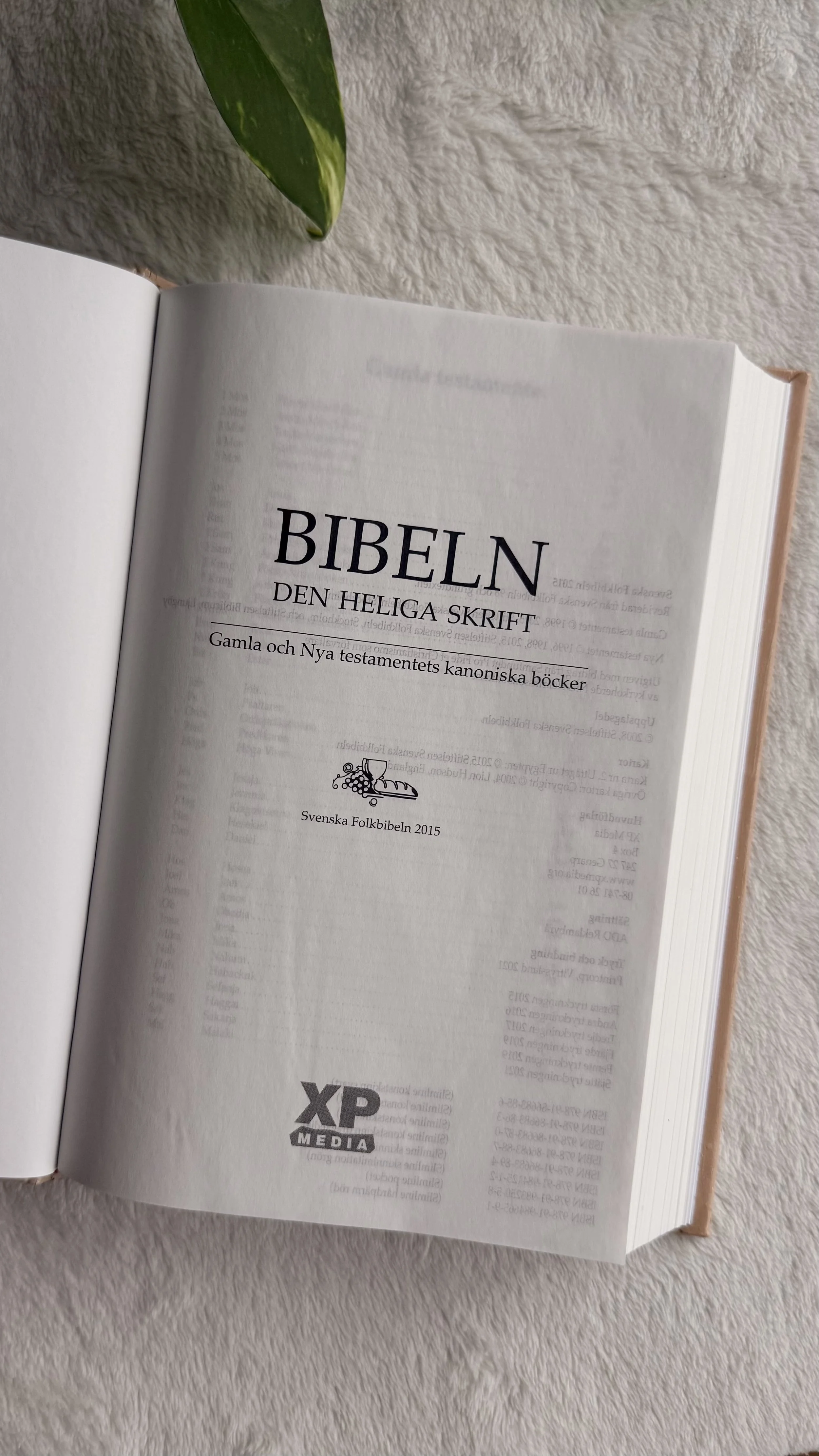 En handmålad Bibel med en växt som har bibliska blad. Knasigt värre men i övrigt väldigt stilren och clean.